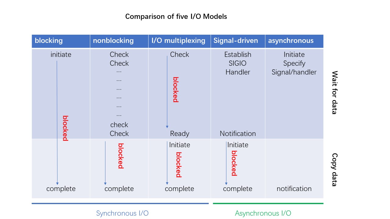 I/O模型分类:阻塞型、非阻塞型、复用型、信号驱动型、异步;